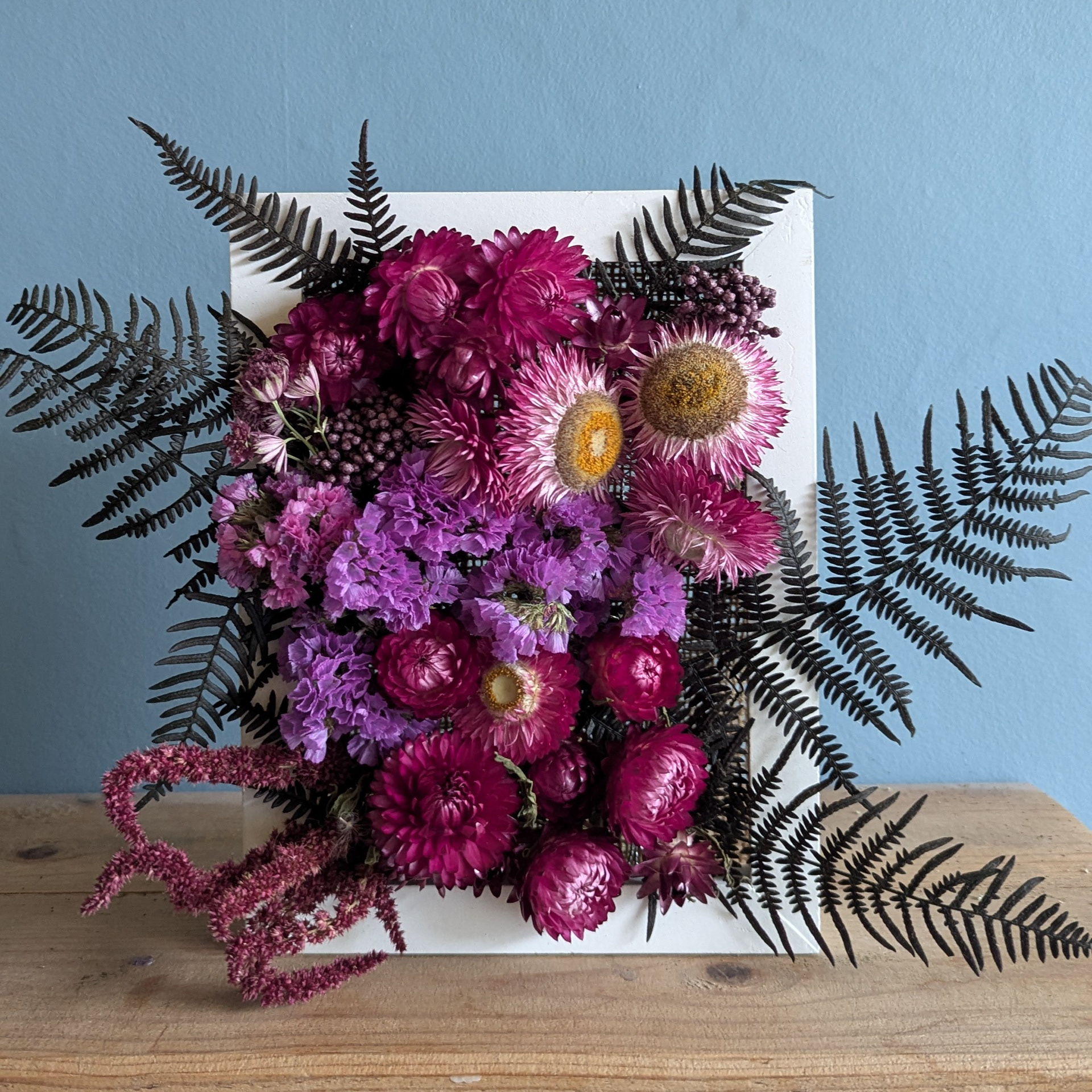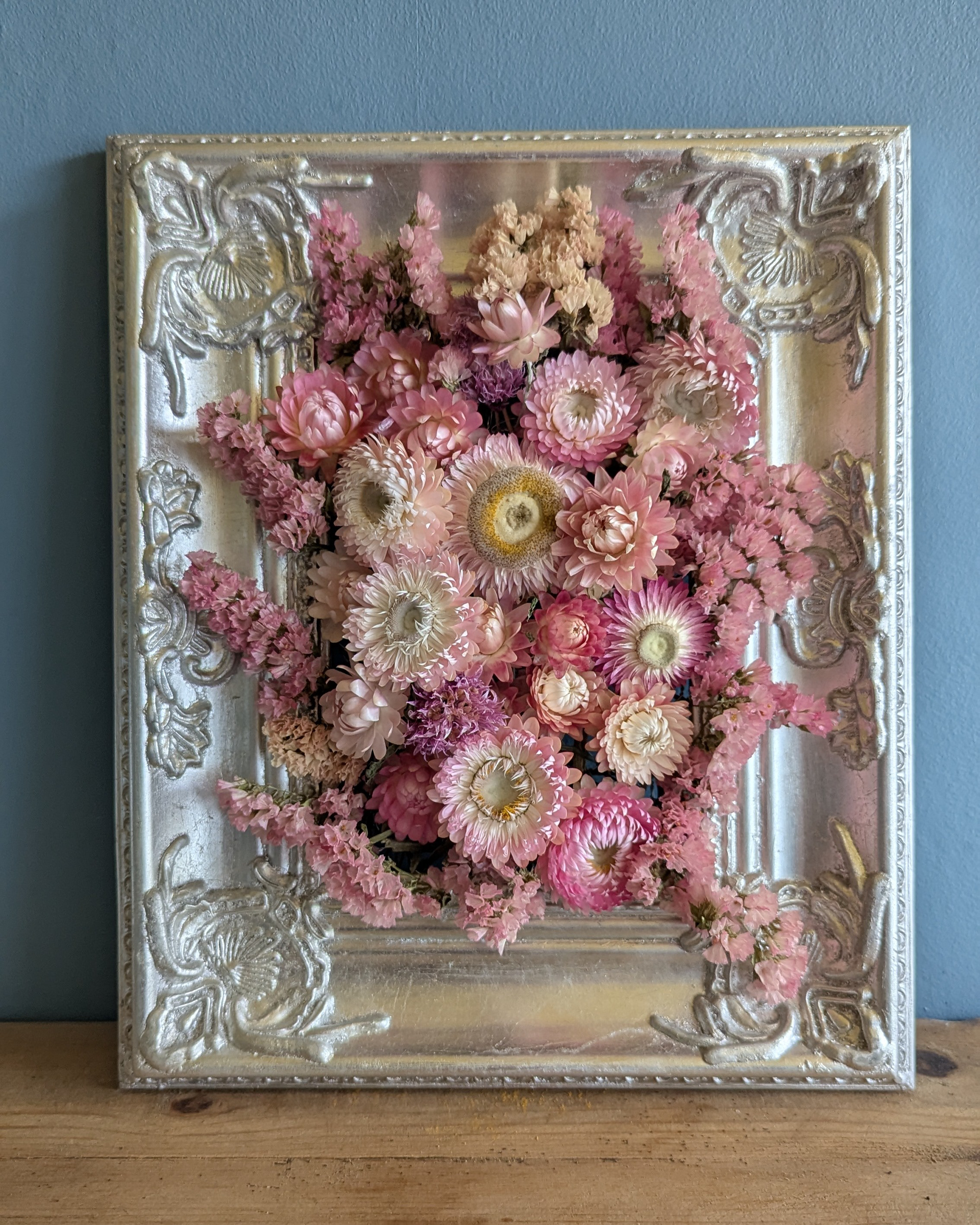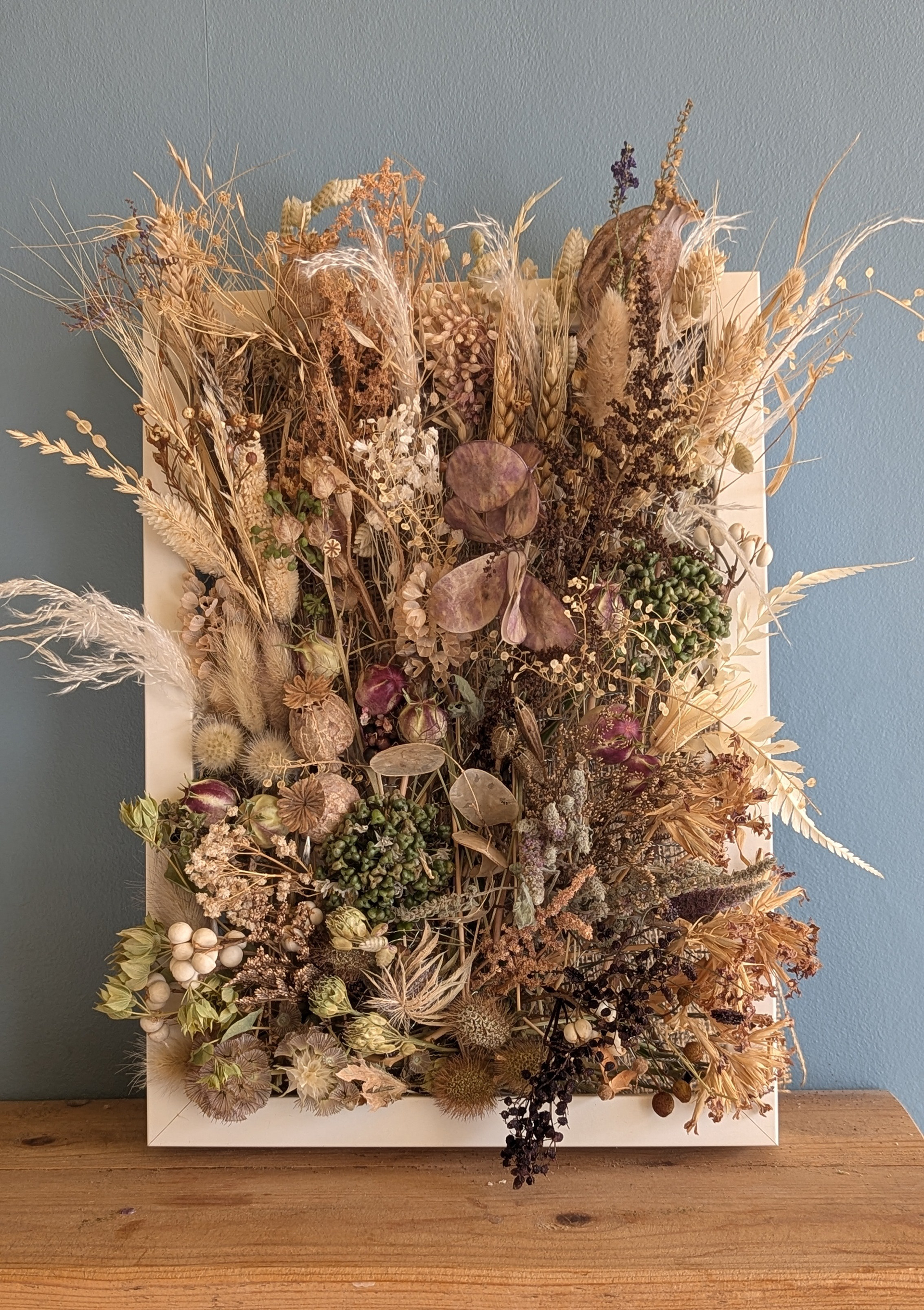 A hands-on nature-led creative experience in a small group setting. Guided, unhurried, a chance to slow down for a couple of hours and create something beautiful. No previous experience needed. Everything you need to make a dried flower wall panel with a repurposed frame.